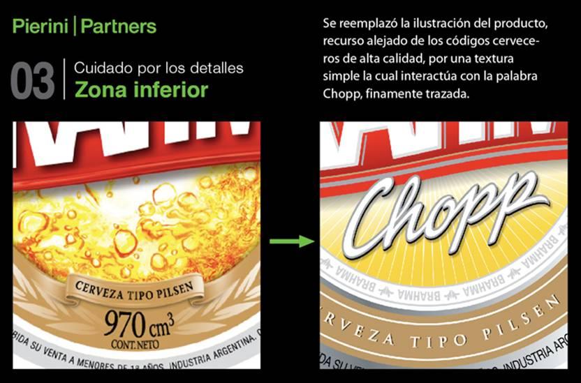 La cervezas han cambiado significativamente su modo de mostrarse. Su público hoy no solo consume sino que además degusta y se ubica frente al producto en una posición mucho más crítica que años atrás. Le exige a su marca que esté a la altura de su nueva visión y valora el esfuerzo del productor por lograrlo. Las marcas vienen experimentando una renovación constante anclándose cada vez más en la calidad intrínseca del producto por sobre valores abstractos como la diversión o el mundo fashion y sus diseños son cada vez más cuidados y sofisticados como consecuencia de esa nueva visión. En este renovado entorno, Brahma no puede permanecer ajeno a la tendencia. Su compromiso con los consumidores la obliga a llevar adelante este desafío aunque prestando especial cuidado en no comprometer, con el cambio, la valoración positiva existente.